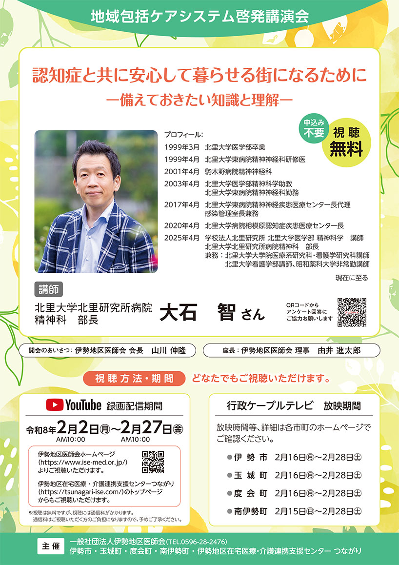 地域住民が要介護状態になっても住み慣れた地域で自分らしい暮らしを人生の最後まで続けることができるよう、医療・介護・予防・住まい・生活支援が包括的に確保された地域包括ケアシステムの実現を目指して、地域住民を対象に講演会をYouTube録画配信と行政ケーブルテレビで開催します。